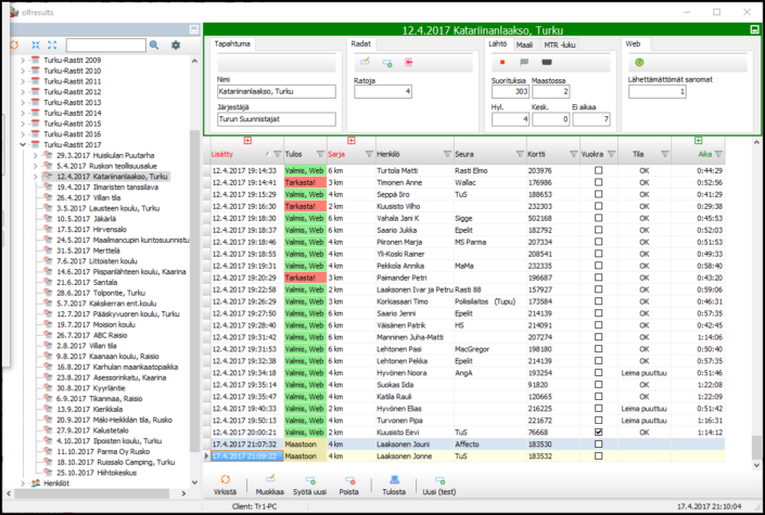 Luonnollisestikin tulokset ovat online -tyyppiset, eli suoritukset ovat web -tulospalvelussa heti, kun suoritus on kirjattu tulospalveluohjelmaan.